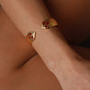 The Flame Bracelet is a bold statement piece inspired by the movement and energy of fire. Crafted with a textured gold-tone finish and accented with vivid ruby stones, it wraps the wrist with a fierce and sculptural elegance.