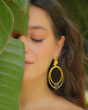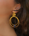 The Orchid Eclipse Earrings merge floral elegance with celestial geometry. A golden orchid rests above radiant circular forms, anchored by a deep blue stone — symbolizing harmony between nature and the cosmos. Bold, graceful, and effortlessly luminous.